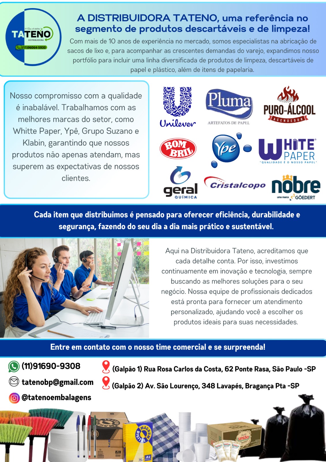 Com mais de 10 anos de experiência, a Tateno Comercial é especialista na fabricação de sacos de lixo e oferece uma linha completa de produtos de limpeza, descartáveis e papelaria. Com atendimento dedicado e compromisso com a qualidade, convidamos você a conhecer nossas soluções e vivenciar a experiência de trabalhar com uma empresa de tradição e confiança.